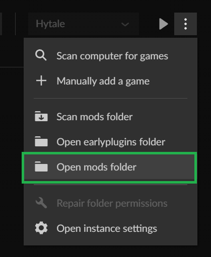 Here, you'll see a few options, find the Open mods folder and click it. Now you should be in your Hytale\UserData\Mods folder and see all your mods. Now you're good to move onto the next step. Almost there.