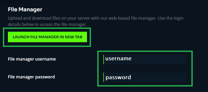 On the new page, click the Launch File Manager in New Tab button. Take note of your file manager’s listed username and password below. Your file manager login is not the same as your account username and password: each server has a unique file manager login.